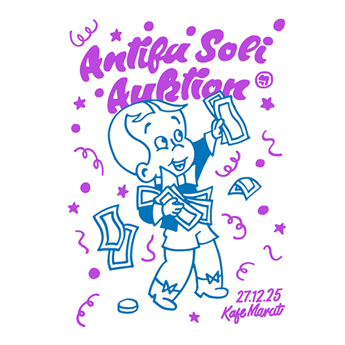 Auch dieses Jahr kommen wieder Kunst und Kitsch, Kuriositäten und Kostbarkeiten unter den Hammer. Und ihr könnt mitmachen: Bringt missglückte Weihnachtsgeschenke, mit Liebe Selbstgebasteltes, vergessene und verstaubte Kleinode und wir verwandeln das Ganze in Solikohle. Wie gewohnt wird der Abend mit kulinarischen und musikalischen Delikatessen abgerundet. weiterlesen>>